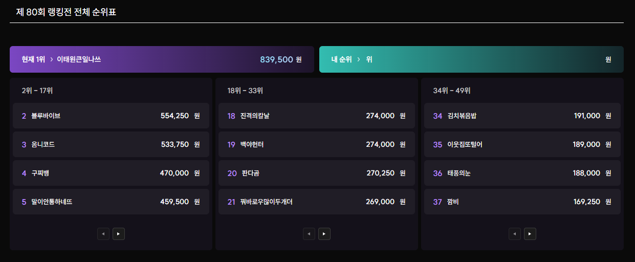 안녕하세요, 아레나 운영팀입니다.80회차 랭킹전 이벤트에 열정적으로 참여해주신 모든 분들께 감사드립니다.치열한 경쟁 끝에 상위 랭커로 선정되신 플레이어분들을 아래와 같이 안내드립니다.※ 순위 보상은 금일 중 순차적으로 지급될 예정입니다.※ 부정 플레이로 확인된 계정은 별도 안내 없이 제외됩니다.매일 새로운 이벤트가 시작됩니다.다음 챔피언은 바로 당신일지도 모릅니다!오늘도 행운이 함께하길. 🍀-아레나 운영팀 드림 0 추천 비추천 0 목록 이전글 다음글
