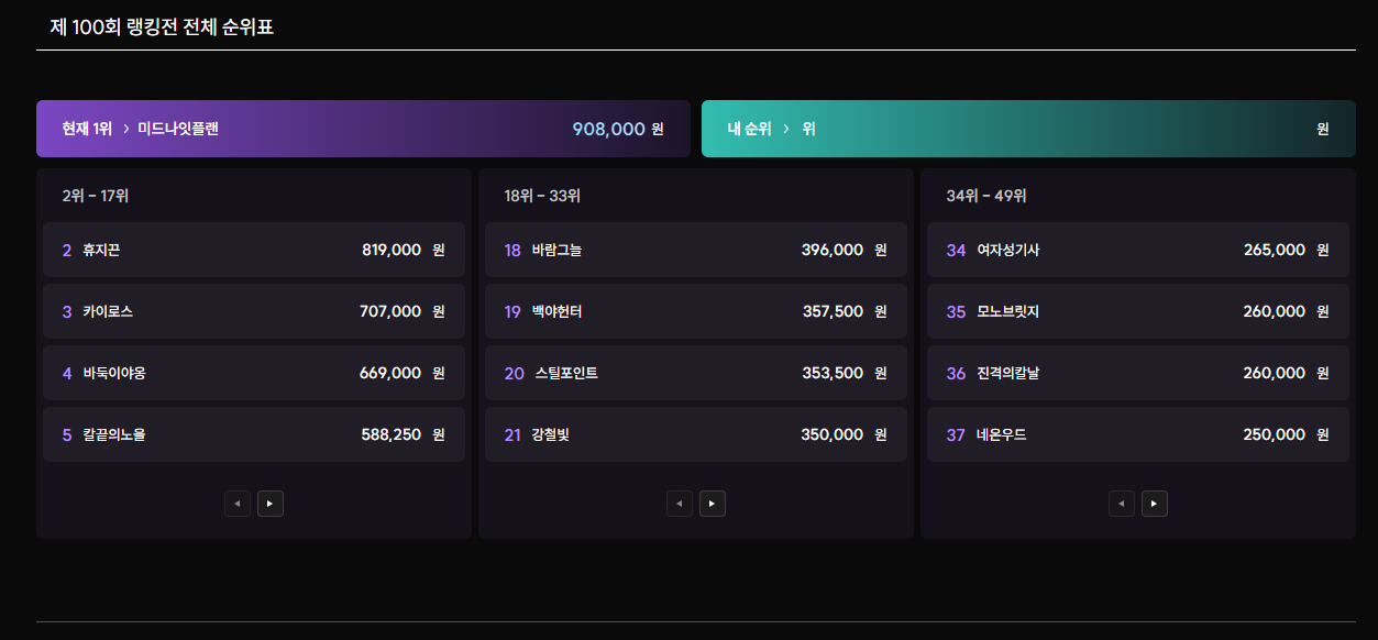 안녕하세요, 아레나 운영팀입니다.100회차 랭킹전 이벤트에 열정적으로 참여해주신 모든 분들께 감사드립니다.치열한 경쟁 끝에 상위 랭커로 선정되신 플레이어분들을 아래와 같이 안내드립니다.※ 순위 보상은 금일 중 순차적으로 지급될 예정입니다.※ 부정 플레이로 확인된 계정은 별도 안내 없이 제외됩니다.매일 새로운 이벤트가 시작됩니다.다음 챔피언은 바로 당신일지도 모릅니다!오늘도 행운이 함께하길. 🍀-아레나 운영팀 드림 0 추천 비추천 0 목록 이전글 다음글
