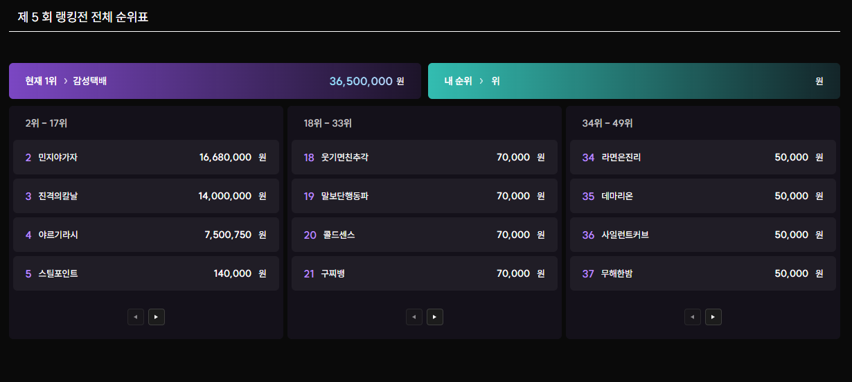 안녕하세요, 아레나 운영팀입니다.5회차 랭킹전 이벤트에 열정적으로 참여해주신 모든 분들께 감사드립니다.치열한 경쟁 끝에 상위 랭커로 선정되신 플레이어분들을 아래와 같이 안내드립니다.※ 순위 보상은 금일 중 순차적으로 지급될 예정입니다.※ 부정 플레이로 확인된 계정은 별도 안내 없이 제외됩니다.매일 새로운 이벤트가 시작됩니다.다음 챔피언은 바로 당신일지도 모릅니다!오늘도 행운이 함께하길. 🍀-아레나 운영팀 드림 0 추천 비추천 0 목록 이전글 다음글