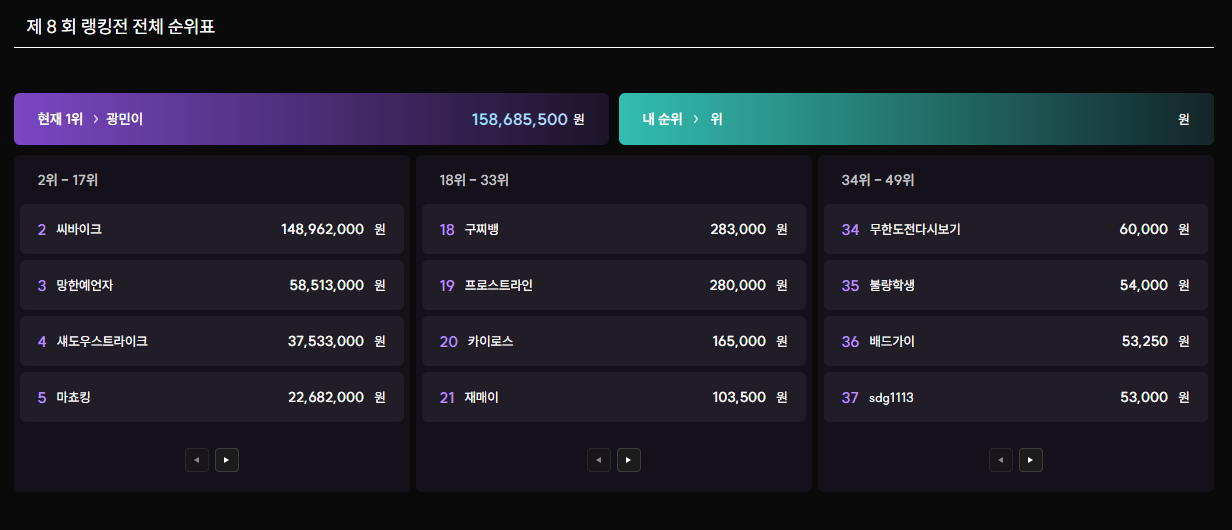 안녕하세요, 아레나 운영팀입니다.8회차 랭킹전 이벤트에 열정적으로 참여해주신 모든 분들께 감사드립니다.치열한 경쟁 끝에 상위 랭커로 선정되신 플레이어분들을 아래와 같이 안내드립니다.※ 순위 보상은 금일 중 순차적으로 지급될 예정입니다.※ 부정 플레이로 확인된 계정은 별도 안내 없이 제외됩니다.매일 새로운 이벤트가 시작됩니다.다음 챔피언은 바로 당신일지도 모릅니다!오늘도 행운이 함께하길. 🍀-아레나 운영팀 드림 2 추천 비추천 0 목록 이전글 다음글