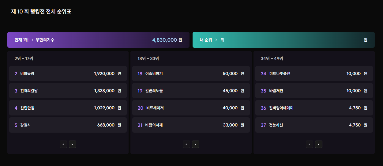 안녕하세요, 아레나 운영팀입니다.10회차 랭킹전 이벤트에 열정적으로 참여해주신 모든 분들께 감사드립니다.치열한 경쟁 끝에 상위 랭커로 선정되신 플레이어분들을 아래와 같이 안내드립니다. 0 추천 비추천 0 목록 이전글 다음글