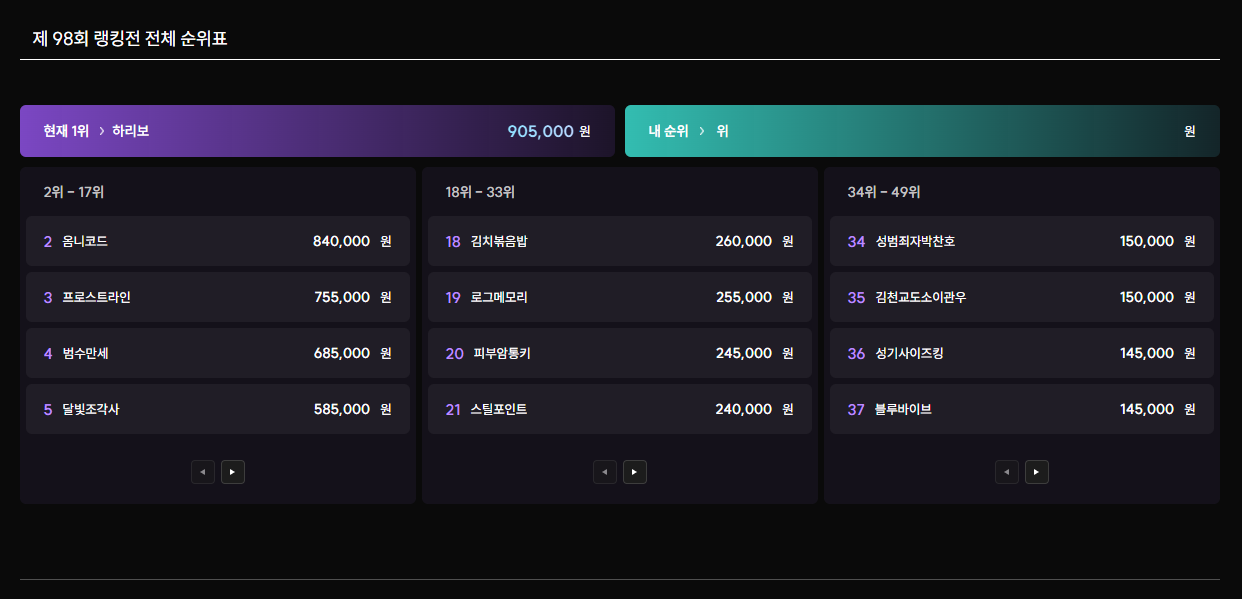 안녕하세요, 아레나 운영팀입니다.98회차 랭킹전 이벤트에 열정적으로 참여해주신 모든 분들께 감사드립니다.치열한 경쟁 끝에 상위 랭커로 선정되신 플레이어분들을 아래와 같이 안내드립니다.※ 순위 보상은 금일 중 순차적으로 지급될 예정입니다.※ 부정 플레이로 확인된 계정은 별도 안내 없이 제외됩니다.매일 새로운 이벤트가 시작됩니다.다음 챔피언은 바로 당신일지도 모릅니다!오늘도 행운이 함께하길. 🍀-아레나 운영팀 드림 0 추천 비추천 0 목록 이전글 다음글