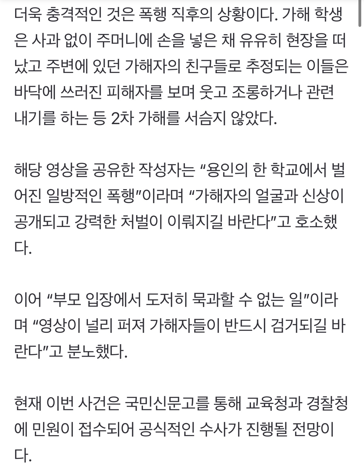 커뮤니티 유머 게시판 살려달라” 애원에도 무차별 폭행…피범벅 된 용인 학폭 영상 충격 황박사 2026-02-10 조회89 추천1 댓글1 1 추천 비추천 0 첨부 파일 없음 수정 목록 이전글 다음글 댓글 보라랑이 2026-02-10 15:34:31 답글 달기 세상에 썪을놈이네 저거.... 댓글 수정 취소 저장 취소 등록 댓글 작성 저장