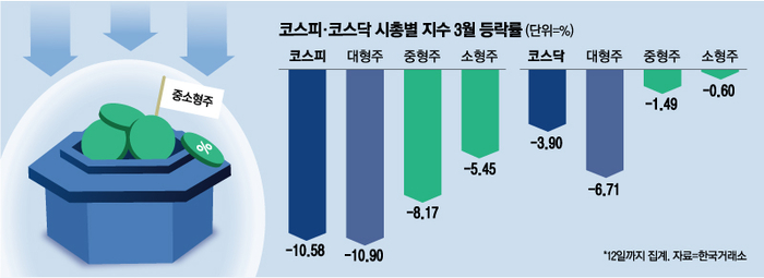 12일 한국거래소에 따르면 3월 들어 이날까지 코스피가 10.58% 하락하는 동안 코스피 소형주 지수는 5.45% 떨어지는 데 그쳤다.